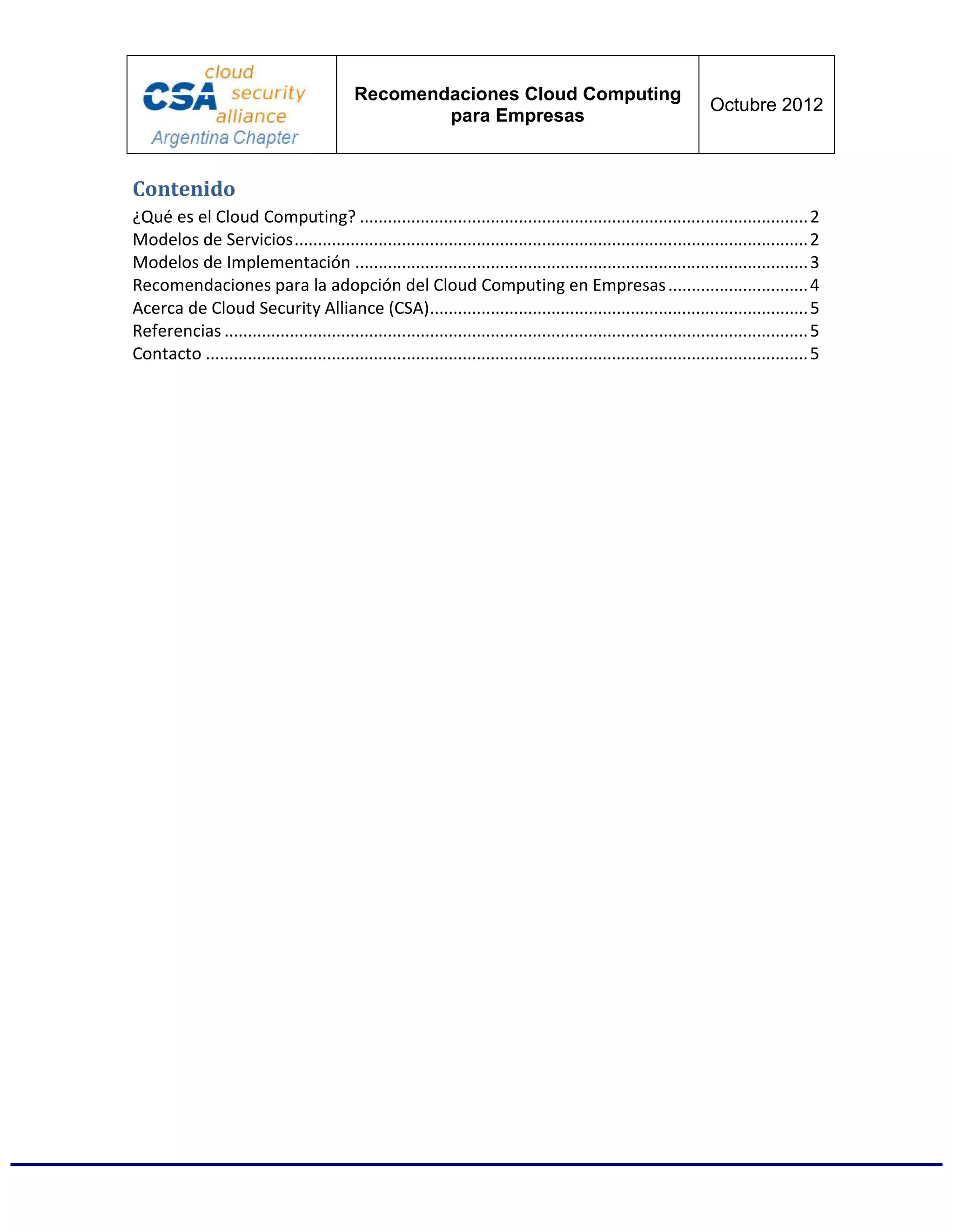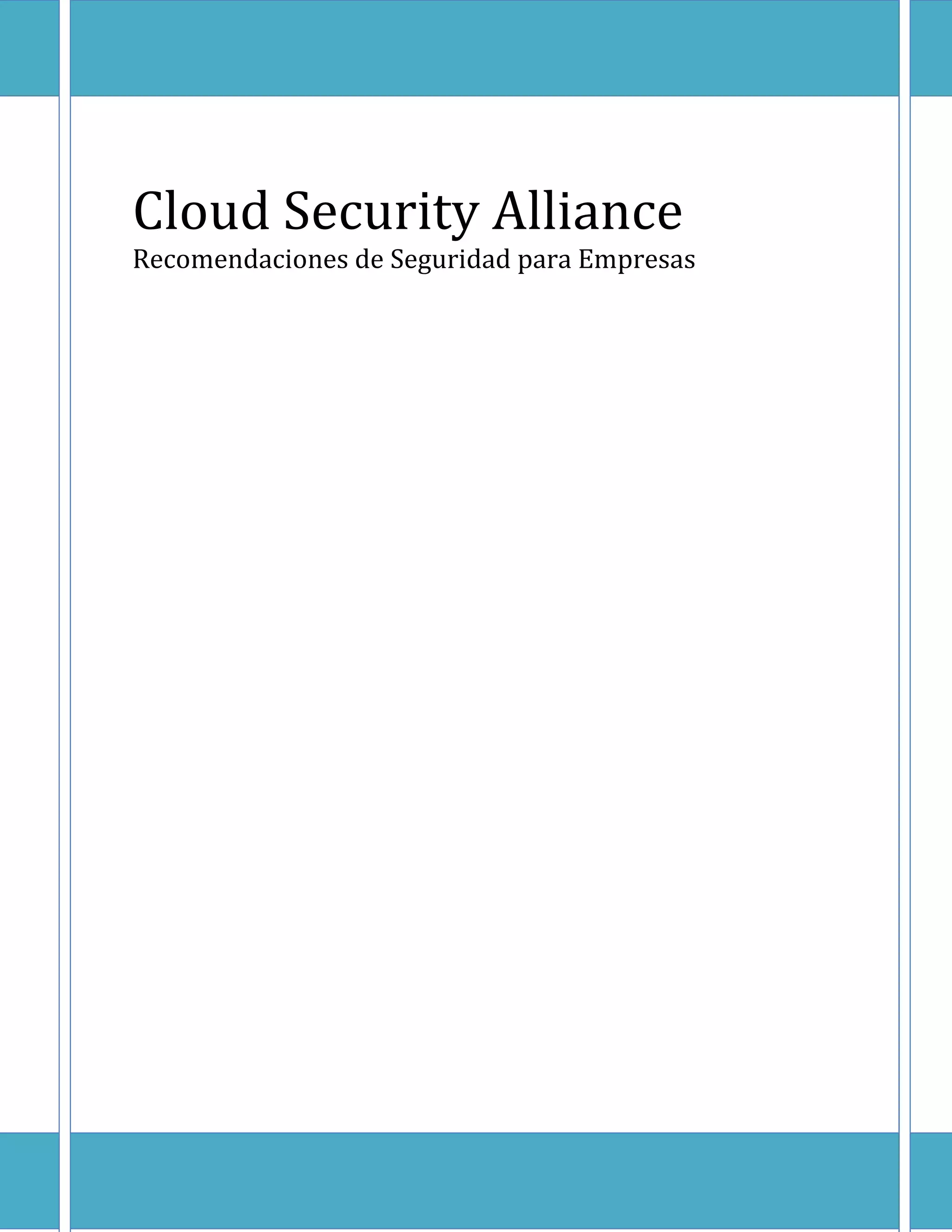 El documento de octubre de 2012 de la Cloud Security Alliance proporciona recomendaciones de seguridad para la adopción del cloud computing en empresas, describiendo modelos de servicios, implementación y pautas para evaluar riesgos y seleccionar proveedores. Se enfatiza la importancia de involucrar a diversas áreas de la organización en el proceso de evaluación de seguridad y en la gestión de contratos con proveedores de servicios en la nube. Asimismo, se destaca que, aunque se elija un servicio de cloud computing, la responsabilidad sobre la seguridad de la información sigue siendo de la organización.