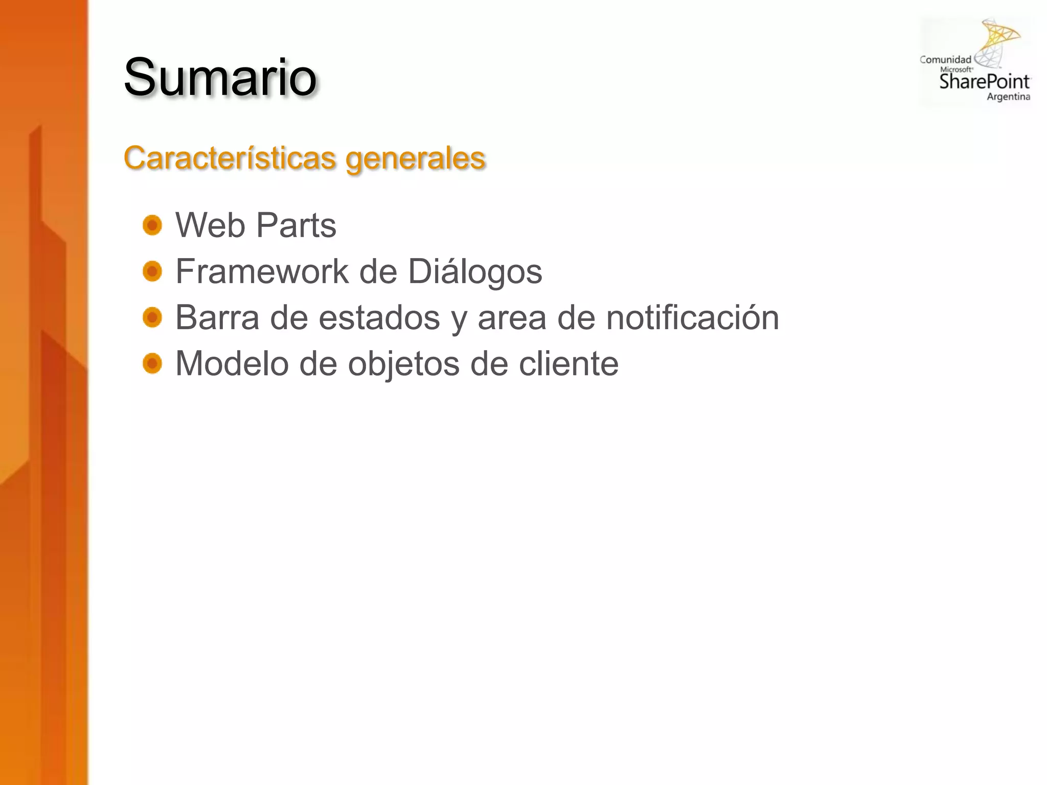 Este documento describe las características y mejoras de las web parts en SharePoint 2010, incluyendo un nuevo enfoque visual para el desarrollo que simplifica el proceso. Se presenta un framework de diálogos que permite mantener al usuario en contexto y cuidados de la interfaz mediante barras de estado y notificaciones. Además, se detalla el modelo de objetos de cliente, su utilización y ejemplos de cómo interactuar con listas y elementos utilizando ECMAScript y Silverlight.
