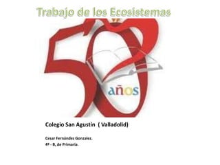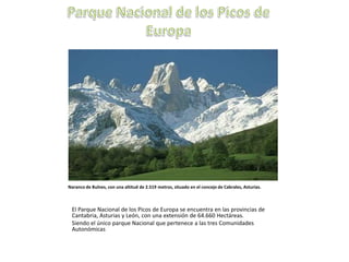 El documento describe el Parque Nacional de los Picos de Europa, localizado en las provincias de Cantabria, Asturias y León en España. Cubre un área de 64,660 hectáreas y contiene una variedad de flora y fauna. La flora incluye robles, hayas, fresnos, encinas, castaños y orquídeas. La fauna incluye corzos, rebecos, zorros, jabalíes, lobos, águilas reales y buitres. El ecosistema varía de acuerdo a la altitud, con