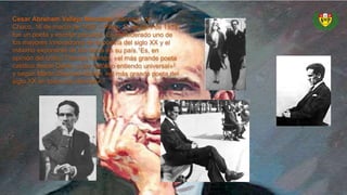 César Vallejo fue un poeta y escritor peruano nacido en 1892 que es considerado uno de los mayores innovadores de la poesía del siglo XX y el máximo exponente de las letras en Perú. El documento proporciona información biográfica básica sobre Vallejo, como su lugar y fecha de nacimiento, y cita opiniones de críticos literarios que lo consideran uno de los poetas más importantes del siglo XX.