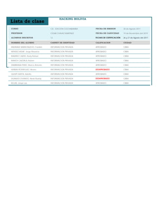 El documento proporciona detalles sobre un curso CSI dictado en Cochabamba, Bolivia entre el 30 de agosto de 2017 y el 19 de noviembre de 2019 por el profesor Cesar Chavez Martinez. Trece alumnos se inscribieron y la mayoría aprobaron, excepto dos que desaprobaron. El documento lista los nombres, identificaciones y calificaciones de los alumnos.
