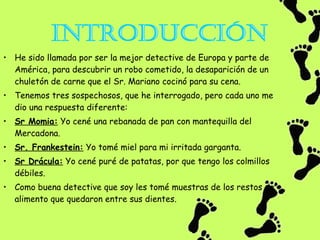 El documento describe un caso en el que se robó un chuletón de carne de la cena del Sr. Mariano. Había tres sospechosos que dieron respuestas diferentes sobre lo que cenaron. La detective tomó muestras de sus dientes para realizar pruebas bioquímicas que identificaran los nutrientes ingeridos. Las pruebas mostraron que el Sr. Drácula dio positivo en proteínas, lo que coincide con el chuletón robado, por lo que fue identificado como el culpable.