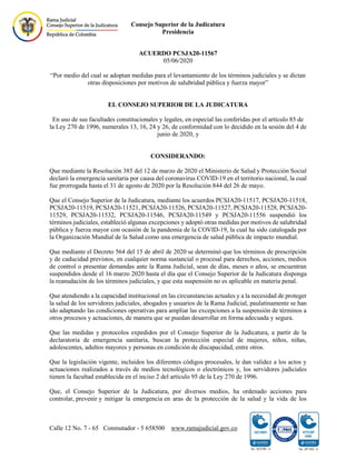Este documento establece medidas para el levantamiento de los términos judiciales y otras disposiciones por motivos de salud pública debido a la pandemia de COVID-19. Se levantará la suspensión de términos judiciales a partir del 1 de julio de 2020, pero se prorrogará la suspensión hasta el 30 de junio para la mayoría de casos, exceptuando acciones de tutela, habeas corpus, y algunos otros procesos. También se establecen protocolos para el trabajo de los funcionarios judiciales de forma virtual y presencial durante la pan