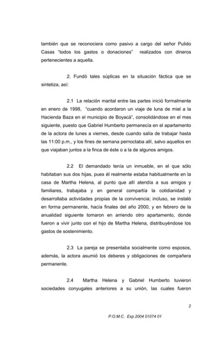 La Corte Suprema de Justicia estudió el recurso de casación presentado por Gabriel Humberto Pulido Casas contra la sentencia que declaró la existencia de una unión marital de hecho y la consecuente sociedad patrimonial entre él y Martha Helena Pilonieta desde el 14 de febrero de 2001 hasta el 27 de octubre de 2003. Tras analizar los testimonios presentados y la documentación sobre el arriendo de un apartamento conjunto, la Corte confirmó que hubo una comunidad de vida entre la pareja y que la unión marital inició el 2 de febrero de 2001,