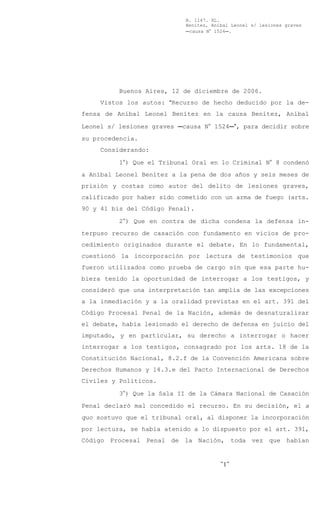 Este documento resume un caso legal sobre lesiones graves. Se condenó a Aníbal Leonel Benítez a 2 años y 6 meses de prisión por dispararle a Juan Horacio Bejarano con un arma de fuego. La defensa apeló alegando que no tuvo la oportunidad de interrogar a los testigos clave durante el juicio. El tribunal superior confirmó la condena, pero la Corte Suprema determinó que se violó el derecho a la defensa al no permitir el interrogatorio de los testigos. El caso fue devuelto para un nuevo juicio.