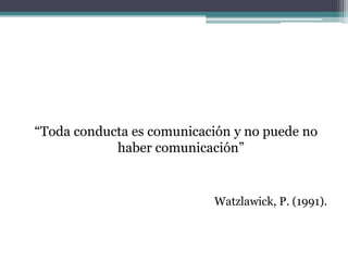 Este documento trata sobre la teoría de la comunicación humana. Explica que toda interacción entre personas es una forma de comunicación, ya sea verbal o no verbal. La comunicación puede dividirse en tres áreas: sintáctica (transmisión de información), semántica (significado) y pragmática (efectos en la conducta). También describe tres axiomas de la comunicación humana y el contexto científico en el que se desarrolló este concepto de comunicación, específicamente los trabajos pioneros de Norbert Wiener sobre ciberné