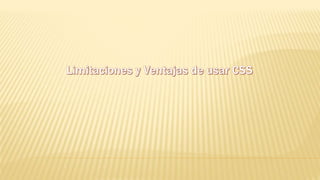 CSS (hojas de estilo en cascada) es un lenguaje usado para definir la presentación de documentos HTML y XML, separando su estructura de su diseño. CSS permite definir estilos en un documento separado o directamente en el documento HTML. Los estilos CSS se componen de selectores, propiedades y valores. Presenta ventajas como el control centralizado del diseño web y la optimización del ancho de banda, aunque también tiene limitaciones como la dificultad para alineamientos verticales complejos.