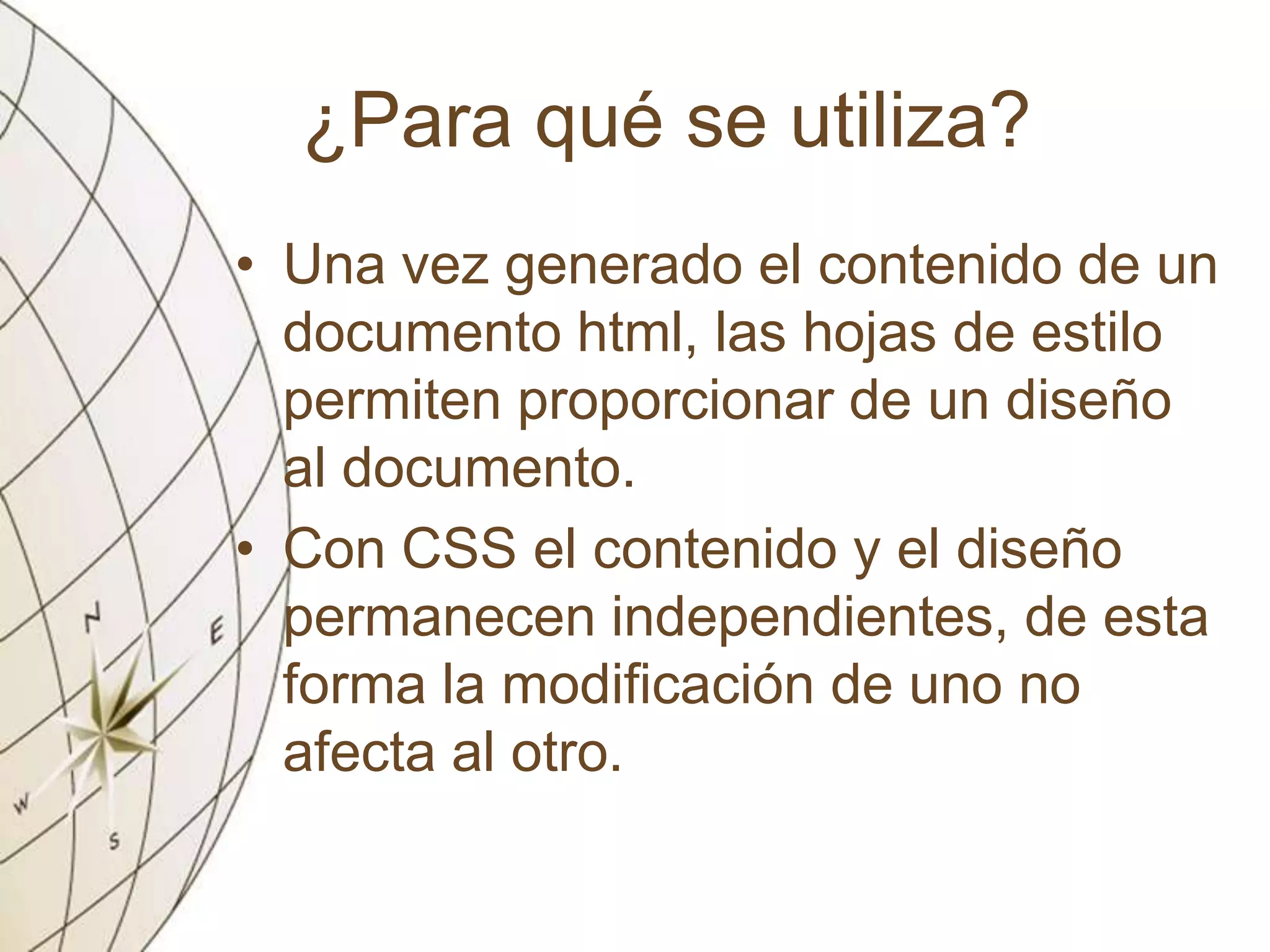 Este documento introduce los elementos básicos de CSS y explica cómo se utilizan las hojas de estilo para dar formato a los documentos HTML de manera independiente al contenido. Describe la estructura de una regla CSS, incluyendo selectores, declaraciones y propiedades/valores. También cubre temas como agrupación de selectores, agregación de declaraciones, y formas de incluir hojas de estilo en un documento HTML.
