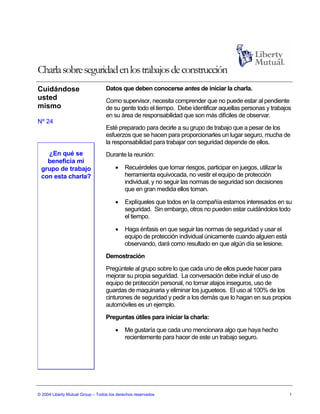 Este documento proporciona consejos para una charla sobre seguridad en el trabajo de construcción. Recomienda que los supervisores reconozcan que no pueden vigilar a su personal todo el tiempo y deben identificar trabajos de alto riesgo. También aconseja enfatizar que, aunque se toman medidas de seguridad, los trabajadores son responsables de su propia seguridad mediante el uso de equipo de protección y el cumplimiento de las normas. Sugiere preguntar a los trabajadores qué pueden hacer individualmente para mejorar la seguridad y usar el