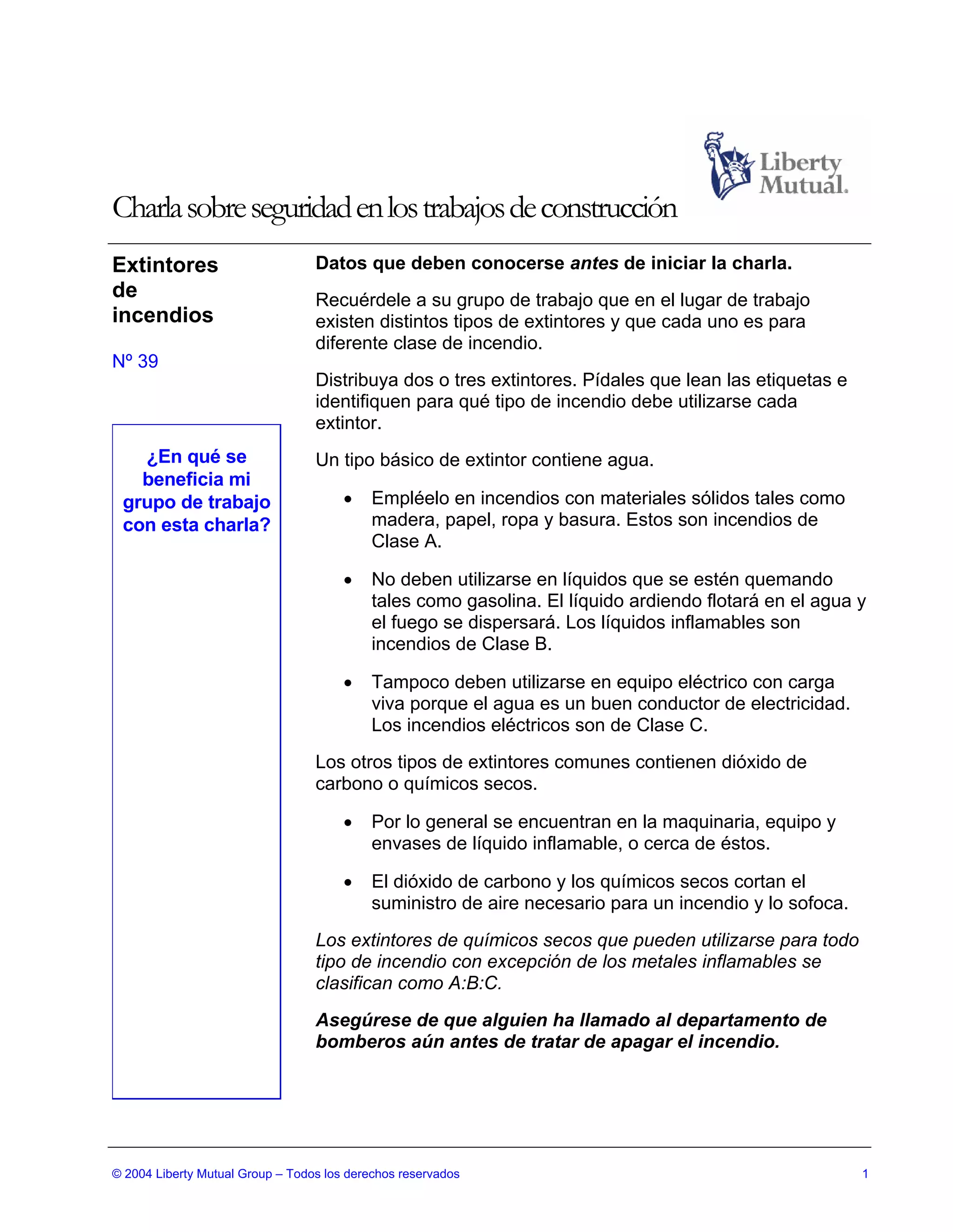 Este documento proporciona instrucciones para una charla sobre seguridad en el uso de extintores de incendios. Se destaca la importancia de conocer los diferentes tipos de extintores y para qué clase de incendio se debe usar cada uno. También incluye instrucciones para demostrar cómo usar correctamente un extintor siguiendo el método PAS (jalar, dirigir, apretar, arrasar). El objetivo es beneficiar al grupo de trabajo enseñándoles a identificar y usar adecuadamente los extintores para apagar incendios de manera segura