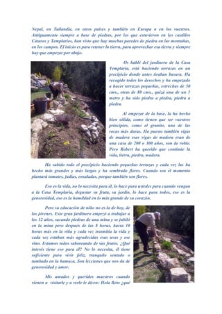 Este documento es una carta escrita por "La Jardinera" donde comparte su entusiasmo y alegría. También habla sobre la importancia de afrontar la responsabilidad de nuestras acciones en lugar de culpar a otros. Da el ejemplo de un jardinero, Robert, que ha construido terrazas en un precipicio sembrando flores y cultivando vegetales con gran generosidad y humildad a pesar de su edad avanzada. Finalmente, la autora enfatiza que la vida se debe vivir paso a paso como los peldaños