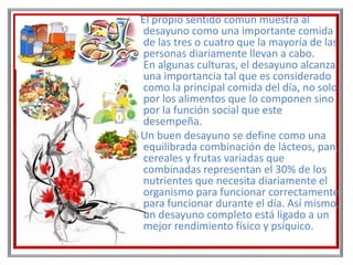 El documento describe la importancia del desayuno para proporcionar nutrientes y energía para enfrentar el día. Un buen desayuno debe incluir lácteos, panes, cereales y frutas para proveer 30% de los nutrientes diarios necesarios. Saltarse el desayuno puede causar decaimiento, falta de concentración y mal humor debido al déficit de glucosa, y afecta negativamente el rendimiento físico y escolar.