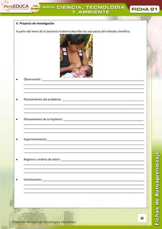 Este documento presenta información sobre la metodología científica y la materia. Introduce los pasos del método científico como observación, planteamiento del problema, planteamiento de la hipótesis, experimentación, registro y análisis de datos, y conclusiones. Explica que los científicos usan este método para investigar. También define la materia como todo lo que tiene masa y ocupa espacio, y presenta algunas propiedades generales y particulares de la materia. Incluye actividades para que los estudiantes identifiqu