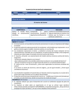 Este documento presenta la planificación de una sesión de aprendizaje sobre el interior del átomo para estudiantes de tercer grado. La sesión dura 2 horas y tiene como objetivo principal que los estudiantes justifiquen que el átomo está formado por el núcleo y la nube electrónica, donde se encuentran los niveles de energía. La sesión incluye actividades como representar el modelo atómico, ver un video, leer textos, realizar ejercicios y representar la estructura atómica. El docente evalúa