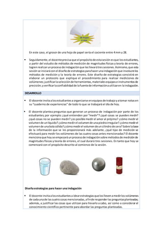 Este documento presenta el plan de una sesión de aprendizaje sobre incertidumbre en medidas directas e indirectas de magnitudes físicas. La sesión tendrá una duración de 3 horas y se dividirá en tres partes: introducción, desarrollo y cierre. En la introducción, los estudiantes observarán diferentes instrumentos de medición. En el desarrollo, diseñarán estrategias para medir volúmenes y aprenderán sobre errores de medición. Finalmente, en el cierre, presentarán sus procedimientos de medición