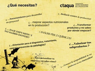 CTAQUA ofrece apoyo y servicios a empresas del sector acuícola a través de instalaciones técnicas y un equipo multidisciplinar con experiencia. Se enfocan en mejorar la producción, aspectos nutricionales, y la internacionalización de productos. Además, disponen de laboratorios y talleres para el desarrollo y valorización de subproductos marinos.