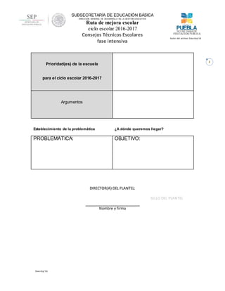 Este documento presenta la tercera sesión del Consejo Técnico Escolar de una escuela para el ciclo escolar 2016-2017. Identifica las prioridades educativas de la escuela, el nivel de avance en cada una, y las principales causas de los resultados. Las prioridades incluyen la mejora de los aprendizajes y la atención al rezago y deserción escolar, así como la convivencia escolar. El documento concluye estableciendo la problemática y objetivo principal de la escuela para el próximo ciclo escolar.