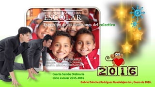 El documento aborda la cuarta sesión ordinaria del ciclo escolar 2015-2016, enfocándose en la evaluación y mejora de las estrategias pedagógicas implementadas en el aula. Se busca que el colectivo docente analice los avances hacia los objetivos de mejora escolar, identifique problemáticas, y establezca acciones concretas para abordar dichas cuestiones. También se propone la creación de un banco de estrategias globales y se invita a los docentes a compartir sus iniciativas para enriquecer el proceso educativo.