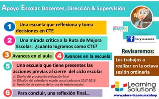 1) El documento describe las actividades propuestas para la octava sesión del Consejo Técnico Escolar con el fin de evaluar los logros alcanzados en los objetivos de la Ruta de Mejora Escolar y organizar las acciones para el cierre del ciclo escolar.