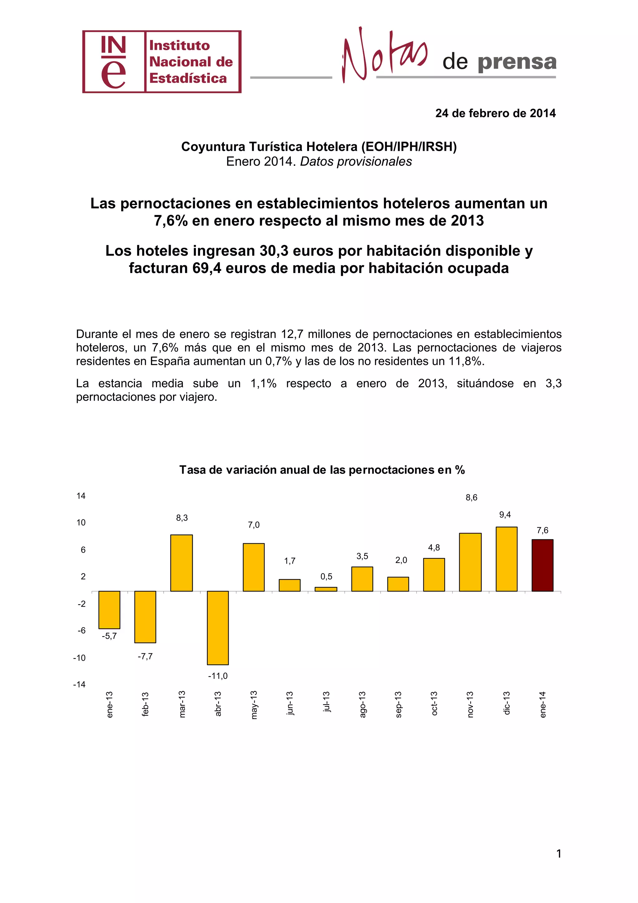 Las pernoctaciones en hoteles españoles aumentaron un 7,6% en enero de 2014 respecto al año anterior. Los viajeros procedentes de Alemania y Reino Unido representaron el 24,8% y el 20,4% del total de pernoctaciones de extranjeros. Los precios hoteleros nacionales no variaron respecto a enero de 2013.