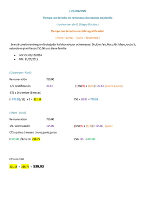 El trabajador laboró de diciembre de 2014 a julio de 2015, recibiendo un sueldo de S/ 750 mensuales. Se calculó que debe recibir S/ 321.18 de CTS por los meses de diciembre a abril, S/ 218.75 de CTS por los meses de mayo a julio, y gratificaciones de S/ 20.83 por enero a junio y S/ 125 por julio, para un total a recibir de S/ 539.93.