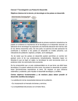 El documento discute la importancia de la ciencia y la tecnología para el desarrollo de los países en desarrollo. Señala que la aplicación de la tecnología ha aumentado el nivel de vida en los últimos 200 años, mientras que su ausencia ha mantenido a los países en desarrollo en niveles precarios. Los países en desarrollo necesitan lograr en décadas lo que los países industrializados lograron en siglos. La ciencia y tecnología deben enfocarse en satisfacer las necesidades básicas de la población,