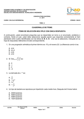 Este documento presenta 25 ítems de evaluación sobre cálculo diferencial. Los ítems incluyen preguntas de selección múltiple con única y múltiple respuesta, así como ítems de análisis de relación y postulados. Los ítems abarcan temas como límites, derivadas, funciones implícitas, puntos críticos y curvatura. El documento proporciona una prueba de evaluación normalizada para el curso de cálculo diferencial.