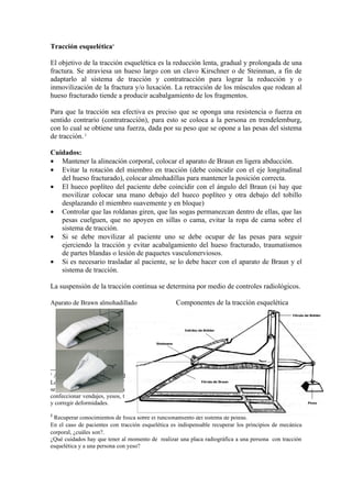 1) La tracción esquelética tiene como objetivo reducir lentamente fracturas mediante la colocación de clavos en los huesos y el uso de un sistema de tracción y contratracción. 2) Es importante alinear correctamente el cuerpo y evitar rotaciones para lograr una reducción adecuada. 3) La suspensión de la tracción se determina por medio de controles radiológicos.