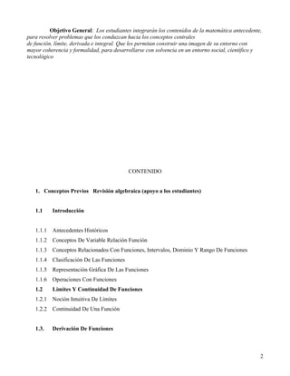 Este documento presenta un cuaderno de apuntes y ejercicios para el curso de Cálculo del CBTA 20. Incluye una introducción al curso y objetivos, así como secciones sobre conceptos previos de álgebra y aritmética, límites y continuidad de funciones, derivación de funciones, análisis de funciones y cálculo integral. También proporciona una serie de ejercicios de revisión de conceptos previos para que los estudiantes desarrollen antes de comenzar el curso.