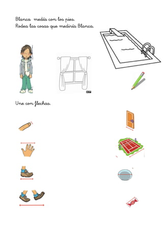Este documento presenta una serie de instrucciones para que dos estudiantes trabajen juntos midiendo y registrando el tamaño de varios objetos usando diferentes unidades como palmos, pies y dedos. Les pide medir y anotar el tamaño de artículos como una camiseta, un bote de lápices, una pizarra y un armario, así como la cantidad de papel necesaria para cubrir una mesa y la longitud de un mural y un pasillo en la escuela. El objetivo es que los estudiantes aprendan a medir trabajando en equipo.
