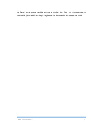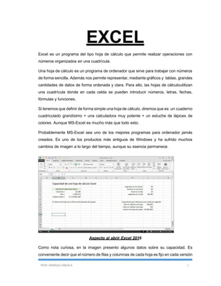 El documento ofrece una guía completa sobre el uso de Microsoft Excel, destacando su capacidad para manejar hojas de cálculo, realizar cálculos mediante fórmulas, y generar gráficos. Se explica cómo identificar celdas y rangos, así como el uso de funciones predefinidas como SUMAR.SI y PROMEDIO. También se abordan técnicas de manipulación de datos, incluyendo suma, resta, multiplicación y división, junto con ejemplos prácticos de aplicación.