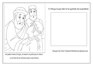La parábola narra la historia de un hijo menor que le pide a su padre la mitad de su herencia para marcharse a un país lejano. Allí derrocha rápidamente todo el dinero en fiestas hasta quedarse sin nada y tener que cuidar cerdos. Arrepentido, decide volver con su padre para pedirle trabajo, aunque cree que no le perdonará. Sin embargo, el padre no solo le perdona sino que celebra su regreso con una gran fiesta.