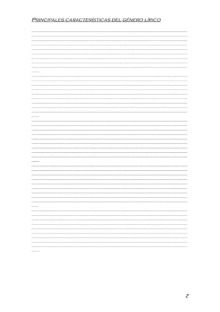 Este documento presenta información sobre el género lírico y recursos poéticos. Incluye definiciones de figuras retóricas como aliteración, onomatopeya, rima, hipérbaton y metáfora. También presenta ejemplos de poesías líricas de autores como Leopoldo Lugones, Jorge Luis Borges, Alfonsina Storni y Alejandra Pizarnik para trabajar en clase. El objetivo es analizar las características y recursos del género lírico en la literatura.