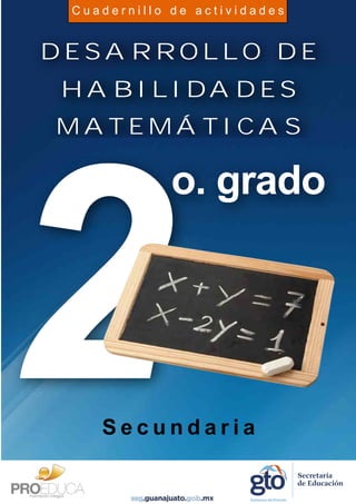 El documento presenta un cuadernillo de actividades para el desarrollo de habilidades matemáticas para estudiantes de segundo grado de secundaria. El cuadernillo fue desarrollado por la Secretaría de Educación de Guanajuato y está dividido en cinco bloques que cubren diferentes temas matemáticos como números, álgebra, geometría y estadística. El objetivo del cuadernillo es fortalecer las habilidades matemáticas de los estudiantes a través de actividades de repaso y autoevaluaciones.
