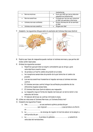 Este documento proporciona información sobre el sistema nervioso, endocrino y los órganos de los sentidos. Explica las funciones de la relación, coordinación y regulación de estos sistemas. Describe la anatomía y fisiología del sistema nervioso central y periférico, incluidos los órganos sensoriales y efectores. También cubre las hormonas y glándulas endocrinas, y cómo estos sistemas se comunican y trabajan juntos para detectar estímulos y generar respuestas.