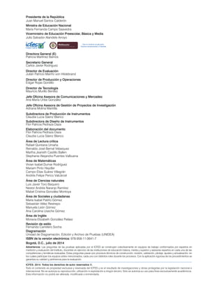 El documento presenta un cuadernillo de prueba para el grado 11, elaborado por el ICFES, que contiene preguntas de diferentes áreas del conocimiento, incluyendo matemáticas, lectura crítica, ciencias naturales, y sociales. Además, establece términos y condiciones de uso para las publicaciones del instituto, enfatizando que el contenido es de propiedad intelectual del ICFES y solo puede ser utilizado con fines académicos. También se describen procedimientos de calidad en la construcción de preguntas y se presenta información sobre encuestas realizadas en contexto educativo.