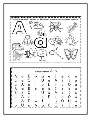 Este documento contiene instrucciones para una maestra sobre cómo enseñar las letras y vocales a los estudiantes a lo largo de varias semanas. La maestra repasará las letras con los estudiantes, les pedirá que busquen imágenes relacionadas y completen dictados y otros ejercicios. El objetivo es que los estudiantes aprendan de forma gradual las letras y su sonido a través de la repetición diaria.