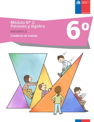 Este documento presenta un cuaderno de trabajo para el módulo 2 de matemáticas de 6° básico en Chile. Incluye 5 clases con actividades sobre patrones y álgebra, incluyendo tablas de valores, secuencias numéricas, y cálculo del perímetro y área de figuras geométricas como triángulos y rectángulos.
