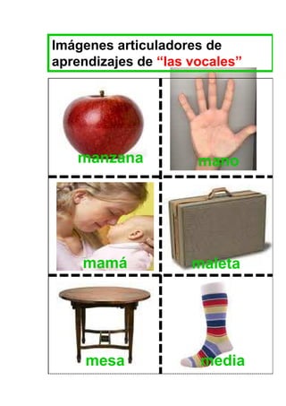 Este documento presenta imágenes de palabras que contienen las vocales a, e, i, o, u para ayudar a estudiantes a aprenderlas. Incluye actividades como completar palabras con las vocales correctas, encerrar las vocales en círculos, y escribir vocales de manera ligada. El objetivo es que los estudiantes practiquen el reconocimiento y escritura de las vocales.