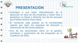 El documento describe el concepto y procedimiento de llenado del cuaderno de obra, el cual es el documento donde se registran las ocurrencias durante la ejecución de un proyecto de construcción. Se explica que el cuaderno de obra debe estar legalizado y firmado por el inspector o supervisor y el residente, y en él se anotan datos como fechas de inicio de obra, avances, modificaciones, consultas y otros hechos relevantes. El documento también presenta el marco legal que rige el cuaderno de obra y especifica cómo debe llenarse durante el inicio de la obra y