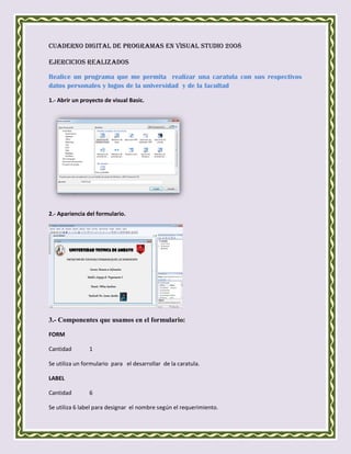 1. Este documento presenta un cuaderno digital de programas en Visual Studio 2008 realizados por Lorena Sánchez para la materia Lenguaje de Programación I de la carrera de Docencia en Informática de la Facultad de Ciencias Humanas y de la Educación de la Universidad Técnica de Ambato.