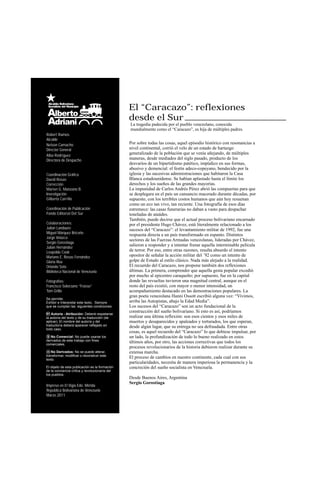 El documento resume los eventos del 27 de febrero de 1989 en Venezuela, conocidos como el "Caracazo". El 27 de febrero, los habitantes de Guarenas se manifestaron contra el aumento en el precio del transporte público. Las protestas se propagaron rápidamente a Caracas y otras ciudades del país en rechazo a las medidas neoliberales impuestas por el Fondo Monetario Internacional. Las manifestaciones resultaron en cientos de muertos y desaparecidos a manos de la represión gubernamental. El documento también analiza las causas