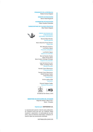 Este documento presenta el equipo editorial responsable de la publicación de un libro de matemáticas para el primer año de educación básica en Ecuador. Incluye los nombres y cargos del presidente, la ministra de educación, el viceministro, el subsecretario y el gerente general de la editorial. Además, enumera los bloques curriculares, módulos y lecciones que componen el contenido del libro, así como sus objetivos educativos.