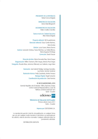 Este documento presenta la portada de un cuaderno de trabajo para estudiantes ecuatorianos. En la portada se incluyen los nombres del Presidente de la República y la Ministra de Educación de Ecuador, así como los créditos de producción del cuaderno. El cuaderno contiene páginas de actividades con iconos que identifican diferentes macrodestrezas de matemáticas, así como secciones para consolidar conocimientos de manera divertida a través de juegos.