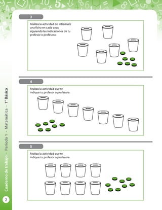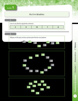 Este documento contiene un cuaderno de trabajo de matemáticas para estudiantes de primer básico. Presenta 10 clases con diferentes actividades numéricas como contar objetos, completar secuencias, sumar cantidades y seguir instrucciones de movimiento. El objetivo es que los estudiantes practiquen conceptos básicos de matemáticas a través de ejercicios prácticos.