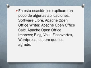 Este documento resume varias aplicaciones de software libre y herramientas web como Apache OpenOffice Writer, Apache OpenOffice Calc, Apache OpenOffice Impress, blogs, Voki, Flashvortex y WordPress. Explica brevemente qué es cada una y sus funcionalidades. También incluye una sección sobre software libre y la opinión del autor sobre la utilidad de estas aplicaciones.