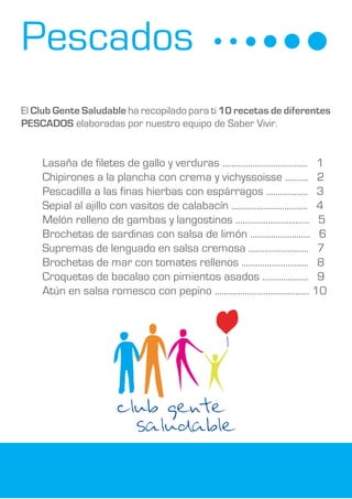 Este documento proporciona 10 recetas de pescados elaboradas por el equipo de Saber Vivir del Club Gente Saludable. Las recetas incluyen lasaña de filetes de gallo y verduras, chipirones a la plancha con crema y vichyssoise, pescadilla a las finas hierbas con espárragos, y sepia al ajillo con vasitos de calabacín, entre otras. Cada receta proporciona una lista de ingredientes y pasos detallados para su elaboración.
