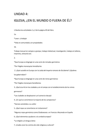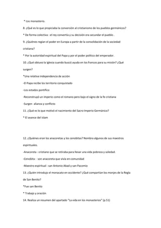 El documento resume la vida en los monasterios durante la Edad Media. Explica que los monjes se dedicaban a la oración y el trabajo manual siguiendo la Regla de San Benito. Los monasterios se construían cerca de fuentes de agua y desempeñaron un papel importante en la conservación de la cultura clásica. La vida giraba en torno a la liturgia y la oración.