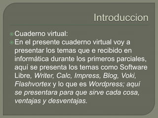 Este documento presenta resúmenes breves de varias herramientas digitales como Software Libre, Writer, Calc, Impress, blogs, Voki, Flashvortex y Wordpress. Explica qué es cada herramienta, cómo funciona y para qué sirve, con el objetivo de que el lector comprenda los temas tratados en informática.