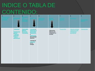 Este documento presenta una introducción al concepto de tecnología y proporciona una tabla de contenido detallada para un documento más largo sobre tecnología. La tabla de contenido incluye secciones sobre materiales, descubrimiento, invención e innovación, electricidad, circuitos eléctricos y herramientas web 2.0.